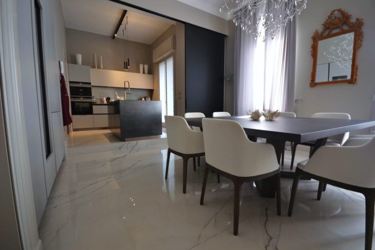 PROGETTI Appartamento Milano n questo appartamento è stata conservata solo una parte del parquet esistente posato a spina italiana, l’altra parte è stata pavimentata con lastre di KERLITE della COTTO D’ESTE e lastre SLIMTECH della LEA Ceramiche, entrambe della dimensione di 100x300mm.Anche per il rivestimento e il pavimento dei bagni è stato utilizzato lo stesso…