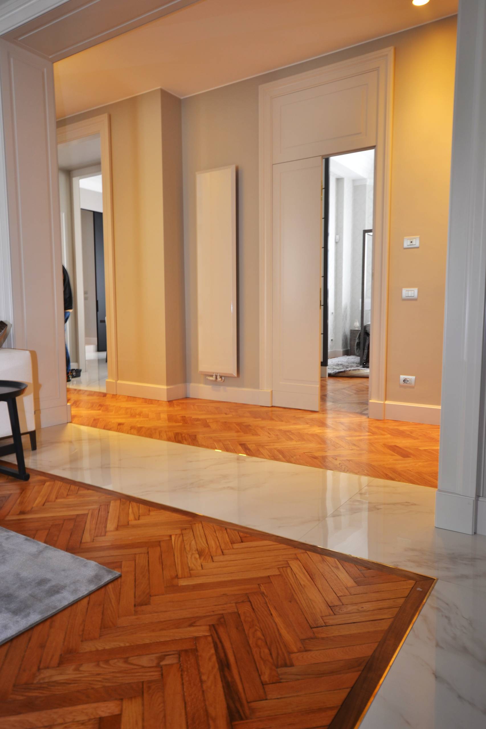 n questo appartamento è stata conservata solo una parte del parquet esistente posato a spina italiana, l’altra parte è stata pavimentata con lastre di KERLITE della COTTO D’ESTE e lastre SLIMTECH della LEA Ceramiche, entrambe della dimensione di 100x300mm.