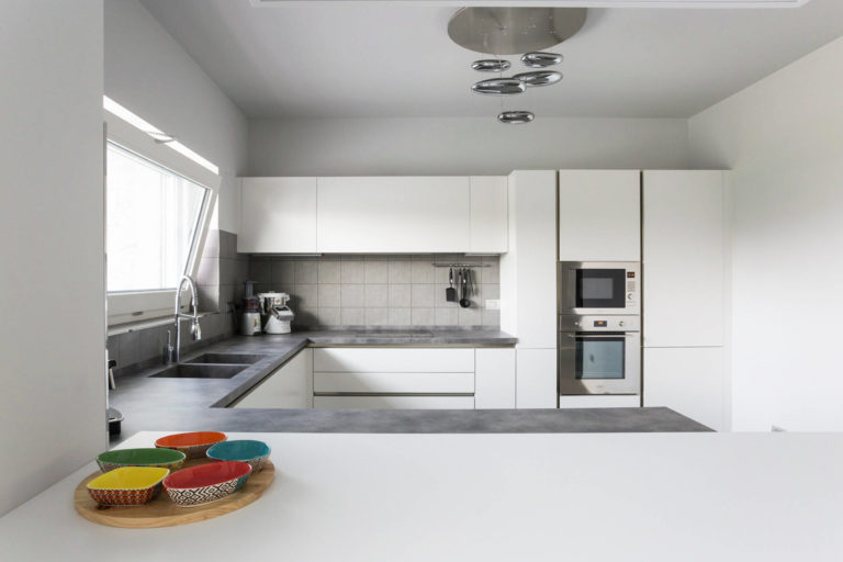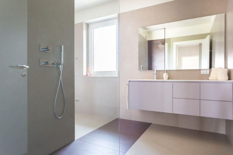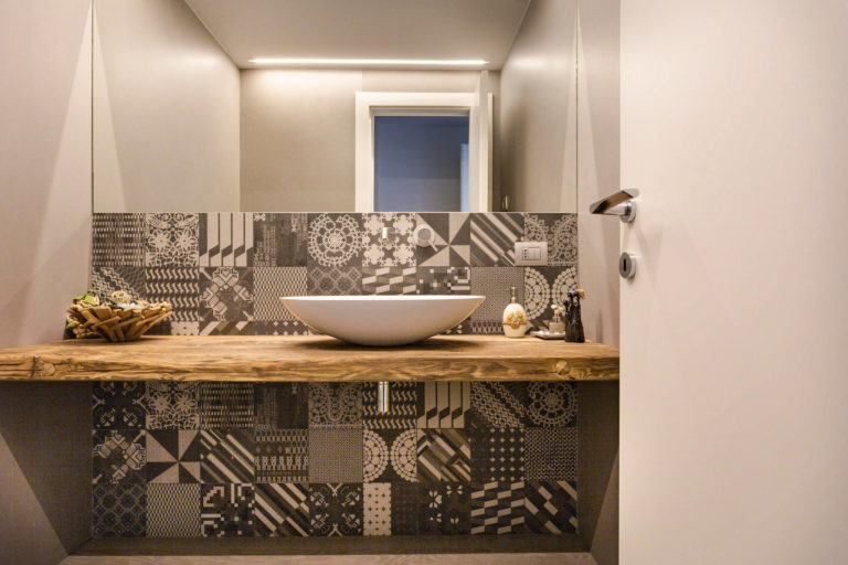 Nel bagno ospiti alla parete decorata con Azulej 20×20 della Mutina abbiamo unito le lastre magnum cm.160×320 della Florim. Le pareti laterali al decoro sono rivestite con un’unica lastra L160H270. Ci piace molto unire le forme micro con quelle macro, le une esaltano le altre. Infatti anche nel bagno della zona notte abbiamo coniugato le lastre della Casamood 80×240 con quelle di formato inferiore 20×80 e di colore diverso per esaltare la zona doccia composta di un piatto realizzato in opera.
